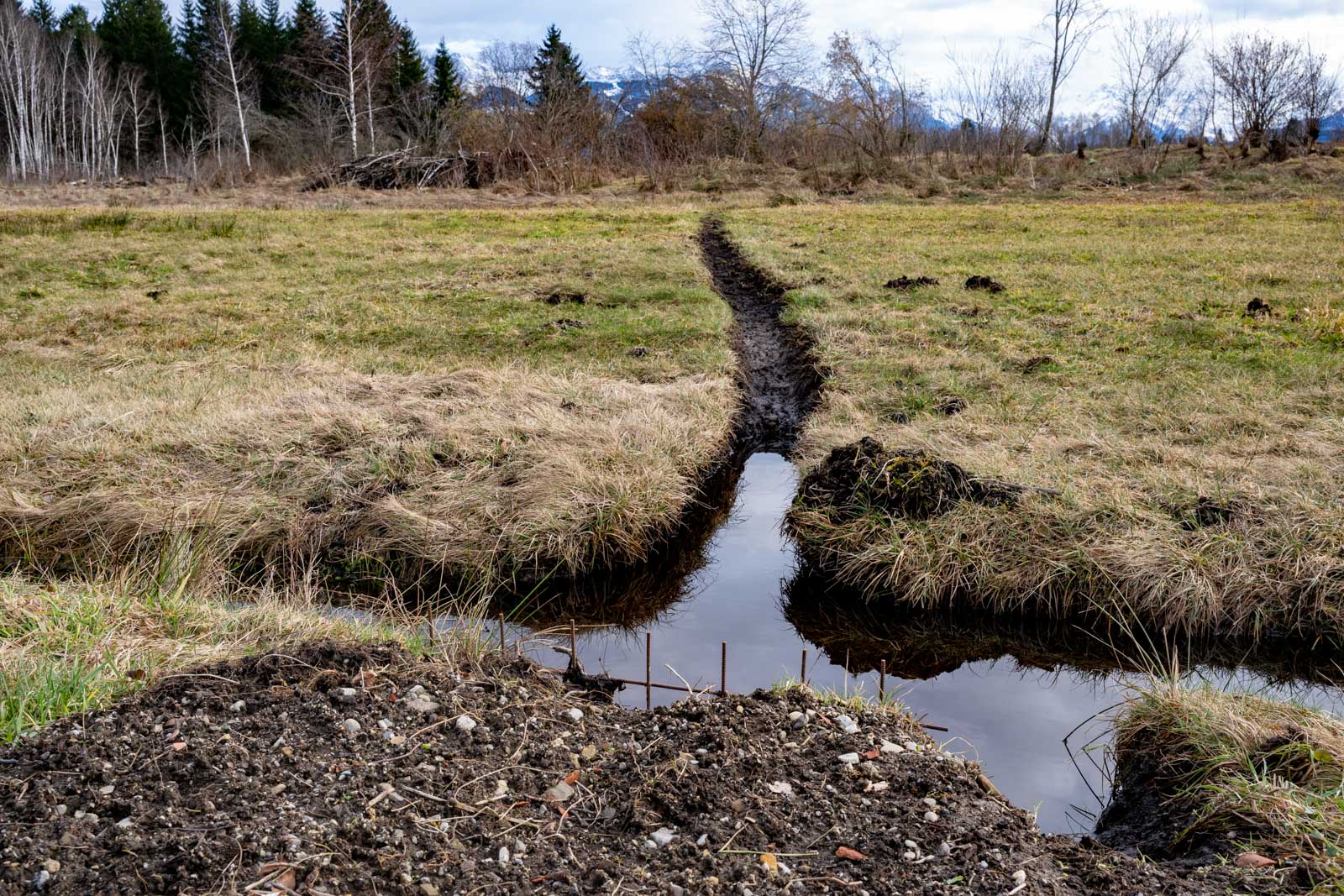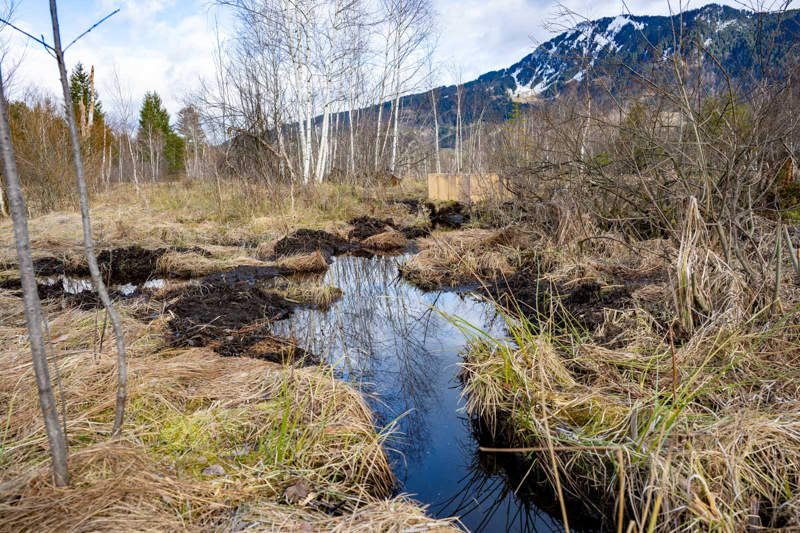Das ganze geht nicht immer konfliktfrei ab. Manchmal werden Dämme zur Moorvernässung untergraben und die dahinter liegenden Staus laufen aus. „Biberstraßen“ queren Streuwiesen und gefährden deren Befahrbarkeit. Es sind immer wieder Sicherungsarbeiten notwendig.