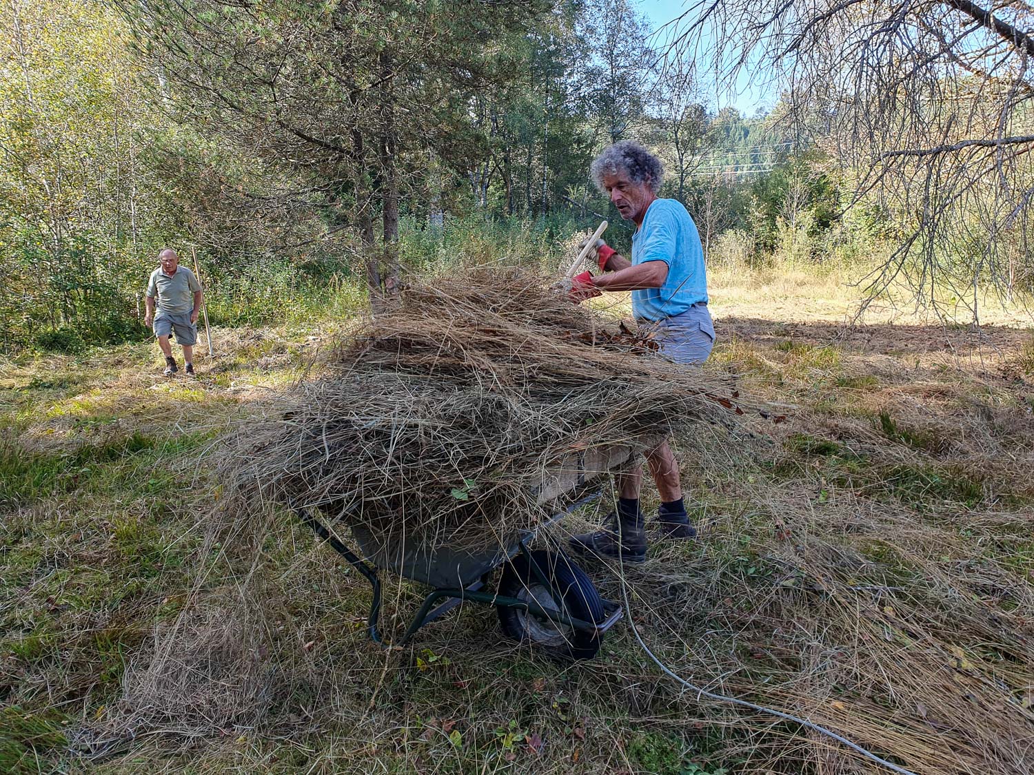 Bei bestem Wetter hatten sich bereits morgens viele fleißige Helfer:innen eingefunden und griffen zu den bereit stehenden Heugabeln, um Maden für den Abtransport zu formen.