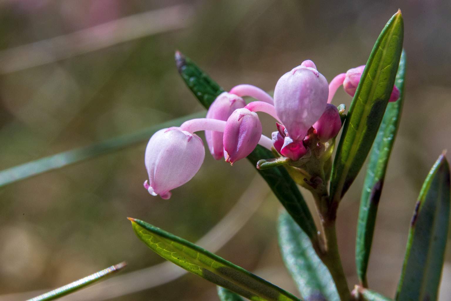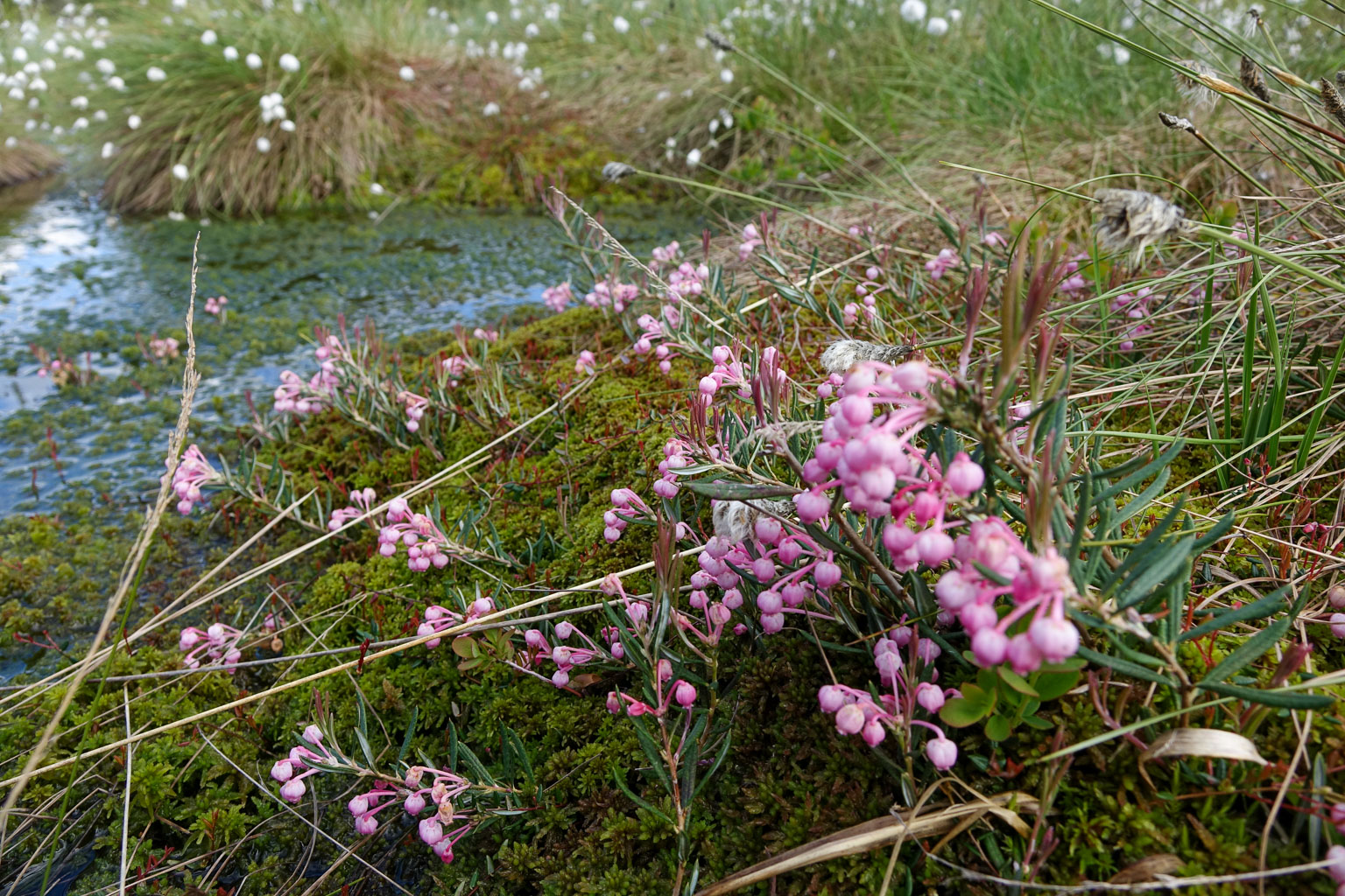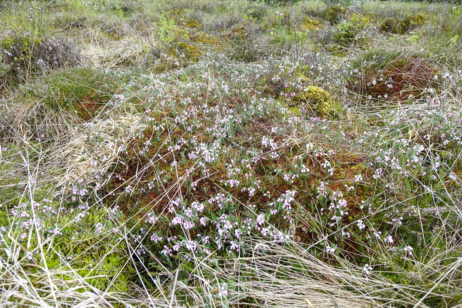 Im Hochmoor öffnen sich gerade die rosafarbenen Glöckchen der Rosmarinheide (Andromeda polifolia).