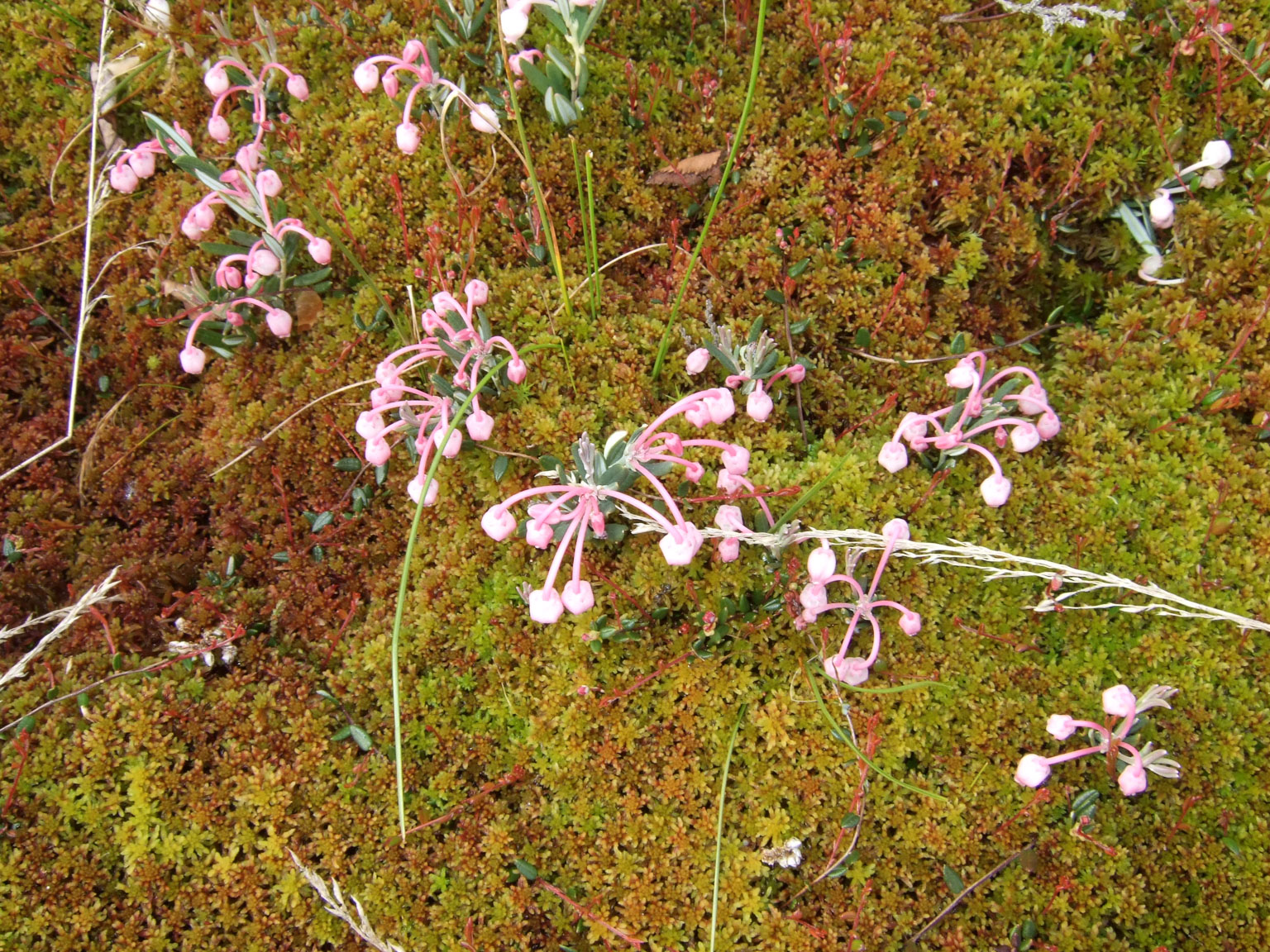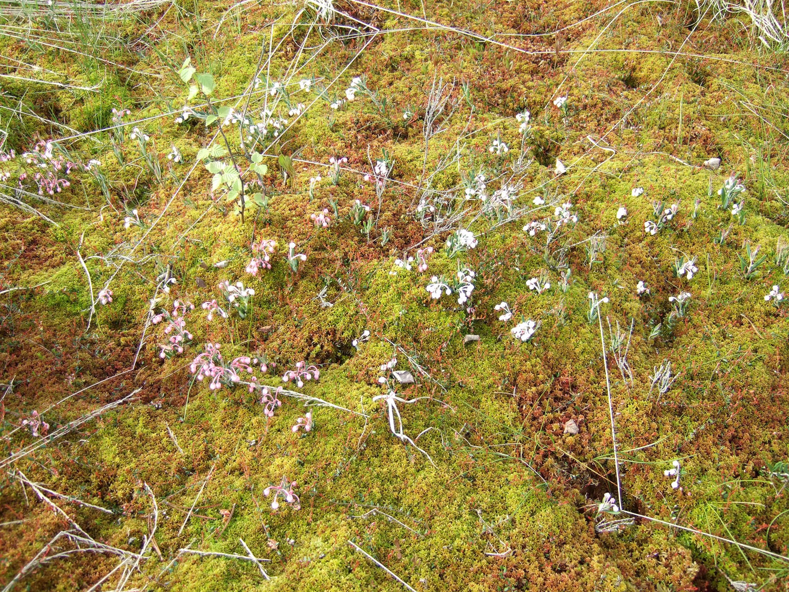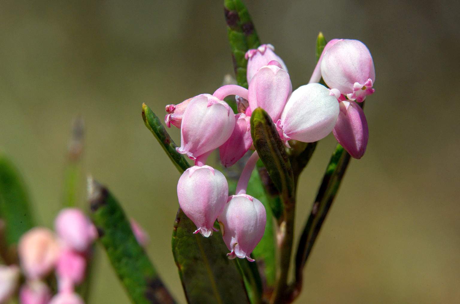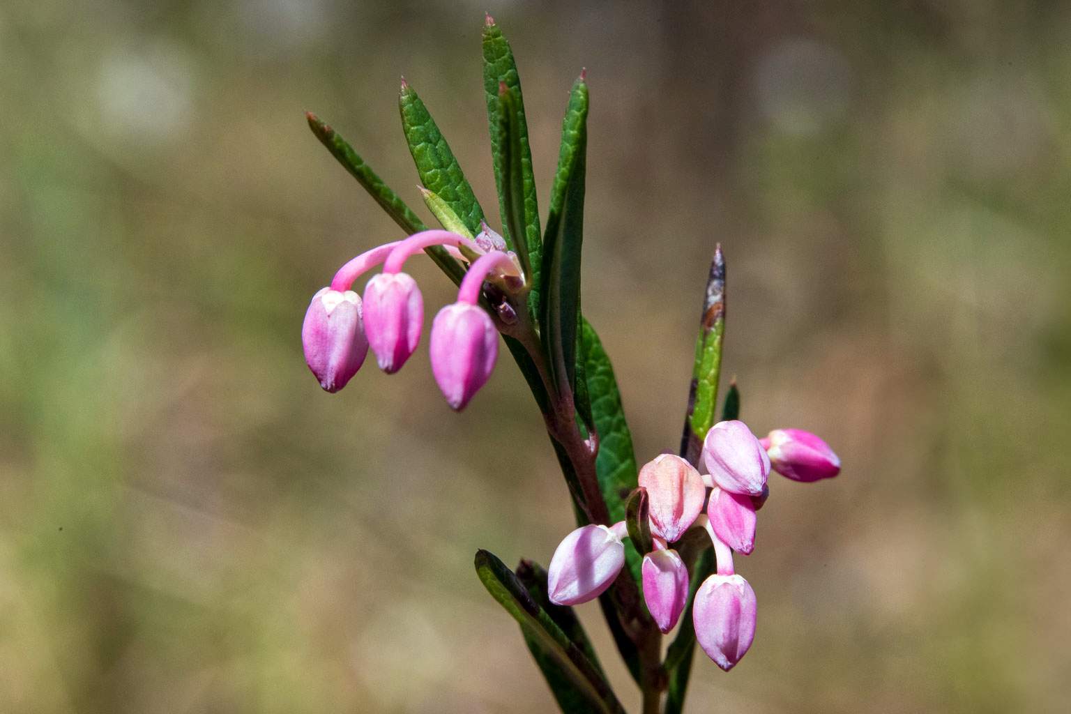 Im Hochmoor öffnen sich gerade die rosafarbenen Glöckchen der Rosmarinheide (Andromeda polifolia).